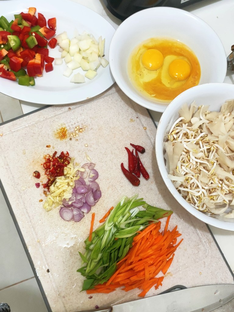 Lalu pertempuran memasak dimulai. Aku percaya diri untuk membuat tiga menu siang ini: tumis tauge jamur, tempe lada hitam, dan telur dadar. Dapur kecilku nampak penuh sesak dan berantakan tapi aku suka sekali. Aku juga hanya punya kompor satu tungku, itu membuatku butuh waktu lebih lama untuk memasak, tapi tidak apa-apa. Aku tidak sabar untuk memasak di dapur yang lebih luas namun tetap minimalis dan juga estetik itu.
